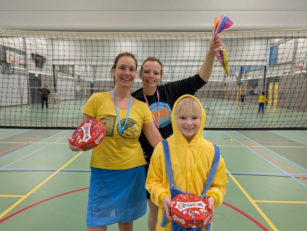 De wedstrijden waren allesbehalve standaard. Spelers kregen hilarische handicaps, zoals een ballon aan het racket of een mini-racket. Dat leverde veel gelach op én verrassende rally’s!